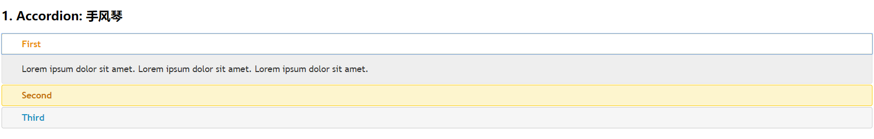 <h2>1. Accordion: 手风琴</h2> <div id="accordion"> <h3>First</h3> <div>Lorem ipsum dolor sit amet. Lorem ipsum dolor sit amet. Lorem ipsum dolor sit amet.</div> <h3>Second</h3> <div>Phasellus mattis tincidunt nibh.</div> <h3>Third</h3> <div>Nam dui erat, auctor a, dignissim quis.</div> </div>