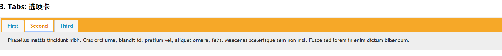 <h2 >3. Tabs: 选项卡</h2> <div id="tabs"> <ul> <li><a href="#tabs-1">First</a></li> <li><a href="#tabs-2">Second</a></li> <li><a href="#tabs-3">Third</a></li> </ul> <div id="tabs-1">Lorem ipsum dolor sit amet, consectetur adipisicing elit, sed do eiusmod tempor incididunt ut labore et dolore magna aliqua. Ut enim ad minim veniam, quis nostrud exercitation ullamco laboris nisi ut aliquip ex ea commodo consequat.</div> <div id="tabs-2">Phasellus mattis tincidunt nibh. Cras orci urna, blandit id, pretium vel, aliquet ornare, felis. Maecenas scelerisque sem non nisl. Fusce sed lorem in enim dictum bibendum.</div> <div id="tabs-3">Nam dui erat, auctor a, dignissim quis, sollicitudin eu, felis. Pellentesque nisi urna, interdum eget, sagittis et, consequat vestibulum, lacus. Mauris porttitor ullamcorper augue.</div> </div>