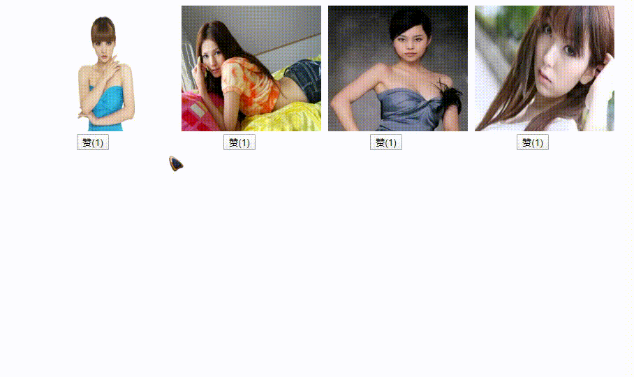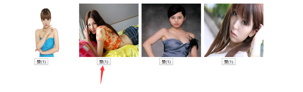 <!DOCTYPE html> <html lang ="en" > <head > <meta charset ="UTF-8" > <title > 选择心仪的</title > <style > ul { list-style-type: none; } li { float: left; margin-left: 10px; } img { width: 200px; height: 180px; } input { margin-left: 30%; } </style </head > <body > <ul > <li > <img src ="images/ly.jpg" alt ="" > <br /> <input type ="button" value ="赞(1)" > </li > <li > <img src ="images/lyml.jpg" alt ="" > <br /> <input type ="button" value ="赞(1)" > </li > <li > <img src ="images/fj.jpg" alt ="" > <br /> <input type ="button" value ="赞(1)" > </li > <li > <img src ="images/bd.jpg" alt ="" > <br /> <input type ="button" value ="赞(1)" > </li > </ul > </body > <script src ="bb.js" > </script > </html >
