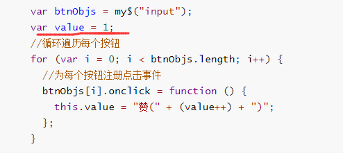 function my$ (tagName ) { return document .getElementsByTagName(tagName); } var btnObjs = my$("input" );var value = 1 ;for (var i = 0 ; i < btnObjs.length; i++) { btnObjs[i].onclick = function ( ) { this .value = "赞(" + (value++) + ")" ; }; }
