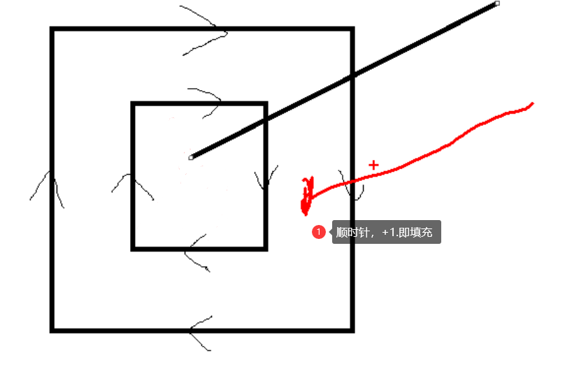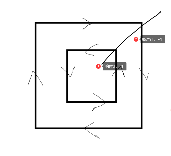 此图可以判断出,内部的正方形计算结果为+2,则填充,同样外部正方形判断以后也填充,所以得到的才会是一个大的完整填充的正方形