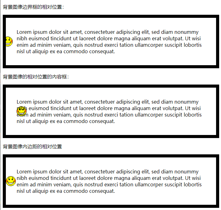 <p>背景图像内边距的相对位置</p> <divid="div3"> Lorem ipsum dolor sit amet, consectetuer adipiscing elit, sed diam nonummy nibh euismod tincidunt ut laoreet dolore magna aliquam erat volutpat. Ut wisi enim ad minim veniam, quis nostrud exerci tation ullamcorper suscipit lobortis nisl ut aliquip ex ea commodo consequat. </div> </body>