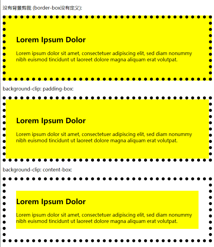 <p>没有背景剪裁 (border-box没有定义):</p> <divid="example1"> <h2>Lorem Ipsum Dolor</h2> <p>Lorem ipsum dolor sit amet, consectetuer adipiscing elit, sed diam nonummy nibh euismod tincidunt ut laoreet dolore magna aliquam erat volutpat.</p> </div>